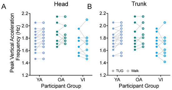 Pairwise comparison of peak frequencies of vertical head (A) and trunk (B) movements (bobs) between the TUG (disk) and walking (circle) tasks for each participant in the younger adult (YA), older adult (OA), and visually impaired (VI) groups. There was no significant difference in stride bobbing frequencies between tasks for all groups.