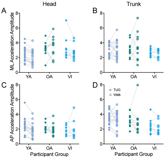 Pairwise comparison of head (A,C) and trunk (B,D) accelerations along the ML (A,B) and AP (C,D) axes, between the TUG (filled circle) and walking (open circle) tasks for each participant in the younger adult (YA), older adult (OA), and visually impaired (VI) groups. There was no significant difference between tasks for any of the acceleration amplitudes.