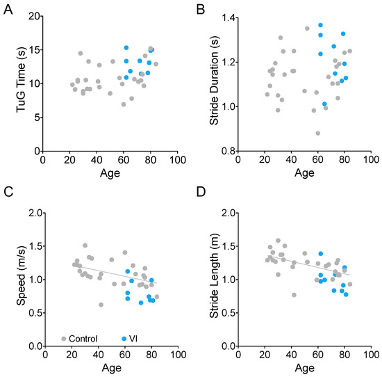 We examined the relationship between age and TUG time (Figure 8A), stride duration (Figure 8B), walking speed (Figure 8C), and stride length (Figure 8D). We found that the latter two (walking speed and stride length) were significantly correlated with age in the visually healthy participants (gray dots in Figure 8, Spearman correlation, ρ = −0.555, p = 0.0018, ρ = −0.652, and p = 0.0001, respectively). The VI group is shown in blue for reference. While this group’s data were consistent with the rest of the sample, they were not included in the age analysis due to the additional confound of visual impairment.