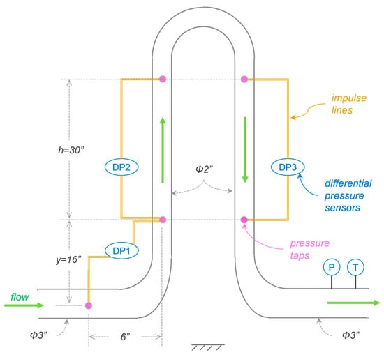 The MPFM has six pressure taps instrumented with differential pressure sensors (DP1, DP2, and DP3) as shown in Figure 1. The horizontal inlet pipe is 3″ in diameter, and the two vertical pipes are 2″ in diameter. DP1 is measured across a reducing elbow, as shown below. DP2 and DP3 are measured across an equal height (h) in the upward and downward flow columns, respectively.