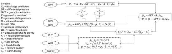 In this model, the gas and liquid densities were first calculated based on known pure-phase properties [15], using P, T, WLR, and salinity. The mixture density and mass flow rate were calculated next, using Equations (2) and (3). The discharge coefficient (Cd) and slip ratio (S) were then iteratively calculated from empirical correlations [4,10]. Note that the mixture density and mass flow rate were also iteratively updated during this step. Then, the gas volume fraction (GVF) was calculated using known equations [2]. Finally, the phase flow rates (Q) at line conditions were calculated [2]. These flow rates can be subsequently converted (not shown) from line to standard conditions, if needed, based on the fluid composition and thermodynamic phase properties [15].