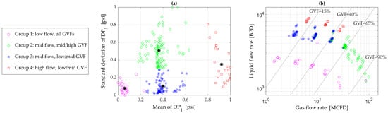As the next step, the k-means machine learning algorithm [18] was applied to the entire dataset. The k-means algorithm is an unsupervised classification algorithm that clusters data with similar characteristics based on distance (e.g., Euclidean distance) in a feature space. The features (the mean and standard deviation of DP1) were first normalized in the range of 0 to 1. The algorithm was implemented with k = 4, and the results are shown in Figure 4a, which shows clearly segregated groups. When these groups are plotted on a flow map (Figure 4b), they clearly correlate well with different flow conditions. For example, in mid-range flows, the test points in a mid-to-high GVF range, presumably slug flows, are in group 2, while those in a low-to-mid GVF range, presumably bubbly or churn flows, are in group 3.