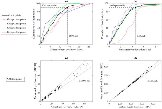 Empirical cumulative distribution of measurement deviations: (a) gas flow rate; (b) liquid flow rate. Measured vs. actual: (c) gas flow rate; (d) liquid flow rate.