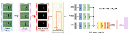 Algorithm block diagram. Starting from the frame-level sequence of video images, YOLOv3 was used to detect pedestrian targets in the images, and body keypoints were extracted for each pedestrian. Discontinuous image sequences were selected for gait feature extraction by the improved ResGCN.