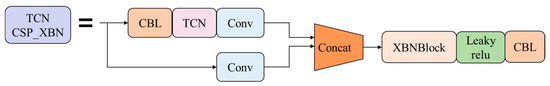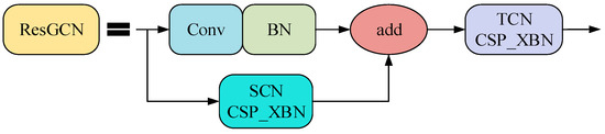 CSP [46] structure can optimise the problem of repeated gradient information in the network; the structure is shown in Figure 5. The CSP structure of the SCN and TCN is optimised with a bottleneck structure in ResGCN, to achieve richer gradient combinations and reduce network calculations. The main idea of CSP is to spread the gradient flow through different network paths by splitting the gradient flow, and to further respect the variability of the gradient by integrating the feature maps at the beginning and end of the network stage. The specific method is to divide the feature map of the base layer into two parts. One branch passes through multiple residual structures, and the other branch directly performs convolution; the two branches performing are concatenated to realise that the characteristics of CSP are consistent with the number of output channels. The model learns more features.