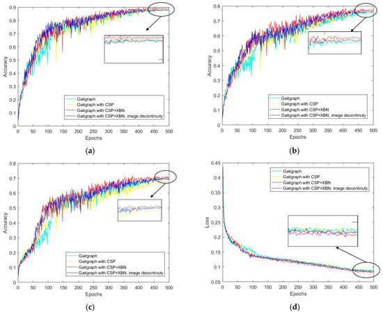 Table 3 shows the comparison between the improved-gait-recognition algorithm network and the baseline. For the photographed pedestrians walking normally, the network before and after the improvement has its own advantages and disadvantages in the recognition process of each angle, and the final average detection accuracy rate increases by 2.3%. For the photographed pedestrian carrying a backpacks and wearing a jacket, the improved gait recognition network in this paper shows better improvement in the recognition accuracy of each angle; its average accuracy is increased by 3.1% and 4.2%, respectively. Specific to each angle, in the case of the lowest recognition accuracy of 180°, the recognition accuracy of the photographed pedestrians carrying backpacks and wearing coats also increased, by 2.4% and 10.5%, respectively. This indicates that, after adding the CSP structure and XBNBlock, the extraction of gait features is more accurate, which effectively improves the defects of the original network in relation to identification in these two cases. The last row in the table shows the recognition accuracy after training on non-continuous frame-level images. Compared with the baseline, the final average detection accuracy of the photographed pedestrians walking normally is increased by 0.5%. For the photographed pedestrians carrying backpacks and wearing coats, the average recognition accuracy of 11 different viewing angles increased by 1.8% and 3.3%, respectively, indicating the effectiveness of the improved network in reducing the dependence on temporal features.