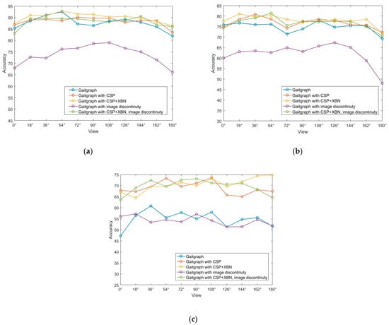 The comparison of recognition accuracy of eleven walking angles in three different walking states in the ablation experiment is shown in Figure 10. The three figures show that, whether or not the input gait image is restricted to discontinuous frames, the overall recognition accuracy of the improved network is higher than that of the baseline network. Figure 10b is in the knapsack state, and the improvement in recognition is more obvious. As can be seen from the line graph of the comparison of the state of wearing a jacket in Figure 10c, adding different modules has a greater impact on the recognition of different angles.