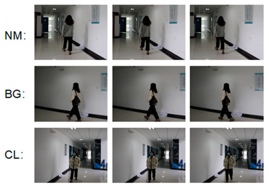 In order to further verify the effectiveness of the algorithm proposed in this paper, we collected gait images in real scenes. We collected three walking states of six volunteers: normal walking (NM), backpack walking (BG) and wearing a coat (CL). Three walking angles of view (36°, 108° and 162°) and two image sequences for each state (#1–2) were used. Some of the data images are shown in Figure 11. In the test, NM#1–2 is used as the gallery and BG#1–2 and CL#1–2 are used as probes; the experimental results are shown in Table 8.