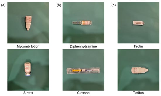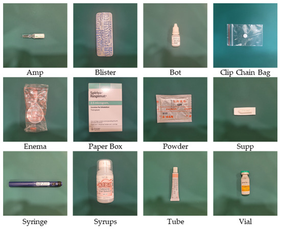 In this study, we collected medication images following the approved image acquisition request from Lotung Poh-Ai Hospital. The dataset comprised a total of 108 medications with diverse packaging classes, such as 12 types of bottles, five types of suppositories, 18 types of blister packs, and one type of enema. The remaining packaging classes consisted of 9 medications each. Figure 1 illustrates visual representations of the different medication packages, highlighting significant variations in their appearance, such as their size, shape, color, text, packaging material, and label markings.