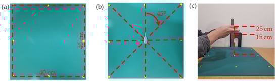 The data-preparation procedure: (a) Place yellow dots on the mat at a distance of 20 cm from each dot, creating a square environment measuring 40 cm by 40 cm. (b) Determine the position and angle of the medication by aligning with the yellow dots. Then, rotate the medication approximately 45 degrees for each placement. (c) Maintain the camera height between 15 and 25 cm, allowing for a range of heights to capture the complete appearance of all medications.