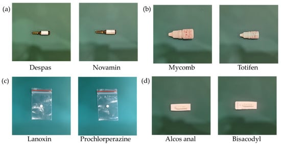 Previous studies have mainly focused on classifying unpackaged pills or medications with the same packaging. However, during the medication-dispensing process, pharmacies encounter various packaging types among nearly a thousand different medications [4]. Moreover, the visual similarities between generic drugs can lead to errors in classification. For instance, Figure 4 illustrates four pairs of medications with similar packaging types, shapes, colors, and other features, resulting in mutual confusion. The examples demonstrate similar drugs (SDs) that possess similar features and are prone to be mistaken for one another: (a) Despas vs. Novamin: they have a dark-colored ampoule and a white label. (b) Mycomb vs. Totifen: they are both white bottles with red letters and packaging. (c) Lanoxin vs. Prochlorperazine: they are packaged in clip chain bags and are white, circular pills. (d) Alcos anal vs. Bisacodyl: they are packaged in white plastic film with green fonts.