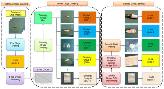 In this study, we proposed a novel two-stage induced deep learning (TSIDL) method to classify diverse-packaging drugs efficiently and accurately. Specifically, the TSIDL method allows the deep learning models to learn the key features of a drug’s image directly based on pharmacists’ dispensing experience. The key features are cropped by an experienced pharmacist from each drug’s image, such as the engraved details on a pill or the text on a box, thus providing deep learning models with more precise content to learn. This special guiding method can result in a higher classification accuracy when classifying drugs.