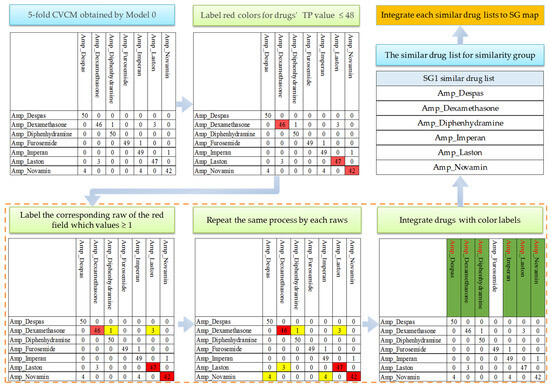 An example of the proposed grouping algorithm for grouping similar medications. Firstly, we constructed a 5-fold CVCM by using Model 0. Then, we examined the true positive values for each medication in the 5-fold CVCM. If the value was less than or equal to 48, we marked that medication red. Next, we checked the false negative values for each medication with a red label. If the value exceeded one or equaled one, we marked those medications in yellow. Subsequently, we grouped the medications with red and yellow labels into an SD list and marked them in green. Then, we could obtain the SD list for the similarity group. We applied the same process for all drug categories. We could obtain the SD lists for SG1-N, and finally, we could integrate them into the SG map.