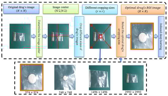 In the proposed IDL workflow, we initially loaded an image with dimensions of 2992 × 2992 pixels. Subsequently, we determined the center of the image at coordinates (1496, 1496). We then extended and cropped four windows of varying sizes from the center, namely 2992 × 2992, 1496 × 1496, 748 × 748, and 374 × 374. Lastly, the selection of the optimal ROI image was guided by an experienced pharmacist from the four different-sized images. This selected image was subsequently subjected to further processing by using IDL.