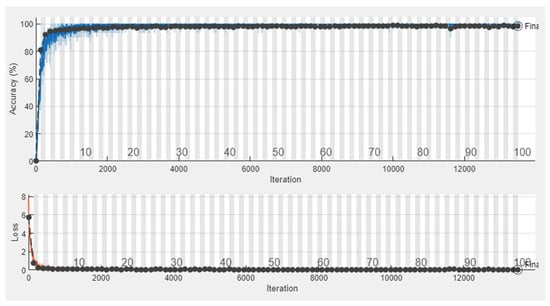 Figure 9 illustrates the training process of the SSCNN. In the upper part of the figure, the blue line represents the training accuracy, and each epoch is denoted by a black dot indicating the recorded validation accuracy. The best validation accuracy achieved was 98.98%. In the lower part, the orange line represents the training loss, and each epoch corresponds to a black dot representing the recorded validation loss. After 50 epochs, we observed that the validation loss decreased to below 0.13 and then stabilized.