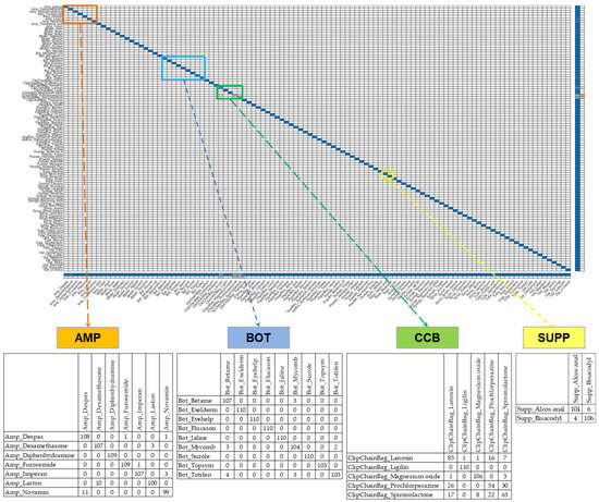 The classification results for drug-name level were obtained from the 5-fold CVCM of the CNN model in the first stage by using the testing set. Upon reviewing the results, it can be observed that significant errors are present in specific packaging classes, namely AMP, BOT, CCB, and SUPP. Particularly, the errors in the CCB classes are particularly pronounced. In the CCB’s 5-fold CVCM, it can be seen that Prochlorperazine has a TP value of only 54, with 26 instances misclassified as Lanoxin and 30 instances mistakenly classified as Spironolactone. Similar situations exist for Spironolactone, with a TP value of only 63, including 17 instances classified as Lanoxin, 8 as Magnesium Oxide, and 22 as Prochlorperazine.
