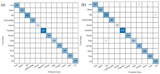A dedicated evaluation focusing on the package-level error was conducted, as illustrated in Figure 11, for the five-fold CVCM of the package level. The five-fold CVCM of the validation set demonstrates perfect accuracy. Notably, there are only three misclassifications in the testing set. Specifically, a bot was erroneously classified as vail, an amp was misclassified as a syringe, and a supp was incorrectly labeled as a bot. The remaining errors in the drug names are associated with the same package classes, which are defined as the drug-name-level error.