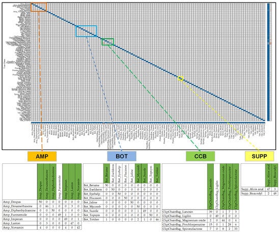 Figure 10 presents a comprehensive summary of the five-fold CV results by using the five-fold CVCM representation for the testing set. Impressively, a drug-name-level accuracy of 98.16% was achieved, indicating the high performance of the proposed SSCNN. However, upon closer examination of the misclassified samples, notable errors were observed at the package level, particularly in the AMP, BOT, CCB, and SUPP classes. Particularly, the errors in the CCB classes are pronounced. In the CCB’s five-fold CVCM, it can be seen that Prochlorperazine has a TP value of only 54, with 26 instances misclassified as Lanoxin and 30 instances mistakenly classified as Spironolactone. Similar situations exist for Spironolactone, with a TP value of only 63, including 17 instances classified as Lanoxin, 8 as Magnesium Oxide, and 22 as Prochlorperazine.