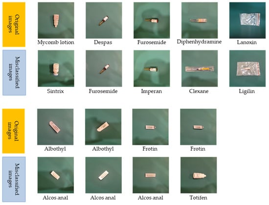Furthermore, we thoroughly examined misclassified images at the package-level classification, as depicted in Figure 12. Despite visual differences, specific common characteristics were observed within the misclassified package groups. For instance, Mycomb lotion and Sintrix shared the same pink font color, while Diphenhydramine and Clexane exhibited similarities in orange and transparent components. Frotin and Totifen shared features, such as a white color, elongated shape, and black font.