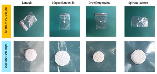 This section presents SG3 as an example to illustrate the IDL effect for the similarity group. SG3 comprises four CCB package drugs: Lanoxin, Magnesium Oxide, Prochlorperazine, and Spironolactone. In addition to their packaging, these drugs share common visual characteristics such as being white, round-shaped tablets with imprints and a glossy appearance on the packaging. Following the previously described procedure, we engaged an experienced pharmacist with ten years of experience to select the optimal ROI size of 374 × 374 for the drugs in SG3. Subsequently, we applied this size to crop the training images and applied the second stage of deep learning processing. As illustrated in Figure 16, the image differences in ROI highlight the distinct drug features. Notably, the imprints and textual content on the tablets are not classifiable before ROI cropping. However, after ROI cropping, the imprints and textual content became more prominent. Furthermore, the cropping process also emphasized the more pronounced differences in the pill’s size. In summary, the uncropped images lacked distinguishing features for drug-name classification, whereas the cropped images exhibited more discernible characteristics than the original image.