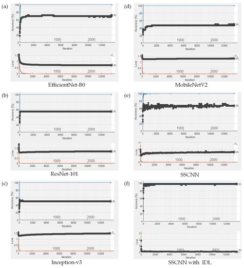 To validate the efficacy of the proposed IDL method, we created different state-of-the-art CNN models trained with the SG3 images before ROI cropping. The initial learning rate was set to 0.0001, and the batch size was set to 32. Stochastic gradient descent with momentum (SGDM) was employed as the optimization algorithm for all the training processes. To ensure a fair comparison, we fixed the training iteration at 13,500 for all the training processes. Figure 17 illustrates the training process of all the CNN models on the SG3 dataset, comparing the state-of-the-art CNN models trained without IDL and SSCNN with IDL. It can be observed that all the CNN models trained without IDL exhibited validation losses that kept exceeding 0.5, and the validation accuracies stayed below 75% throughout the training process.