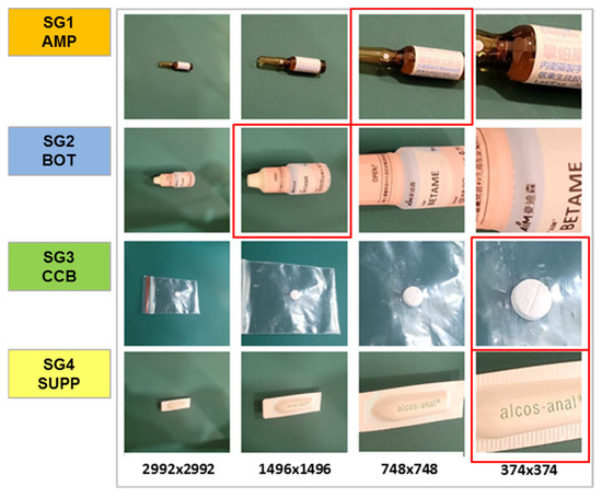 In this section, the IDL effect for SG1-5 is discussed in detail. First, we applied the proposed IDL method to the SG1-4 images. We engaged a pharmacist with more than ten years of experience to evaluate the different drug features of SG1-4 and determine the optimal ROI for each SG. The ROI images were cropped for each SG, and the results were presented in Figure 18, followed by an evaluation and interpretation by the pharmacist. For AMP, contour features and proportions were deemed less significant, and the labels exhibited immense importance. In the case of BOT, both the contour details of the bottle and the differences in the labels needed to be considered, resulting in the preservation of the overall proportions and label distribution. For CCB, much of the packaging could be cropped, and we minimized the package reflection to enhance the clarity of the tablet imprints. For SUPP, detailed information about the label’s text and pattern distribution was deemed necessary, and thus we chose a larger cropping size. Considering the satisfactory classification performance of SG5 at its original size, we maintained the original size to reduce the labeling cost and computational burden associated with image-processing operations.