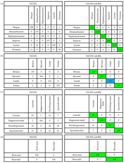(a–d) are the 5-fold CVCM for SSCNN without and with IDL for SG1-4, respectively. The improved TP values are indicated in green, and the unchanged value is marked in blue. It can be observed that the IDL method resulted in significant improvements in the TP values of each SD across all SGs, except for Suzole, where the values remained unchanged. Particularly in SG3, there are significant improvements in TP values for all drugs. Prochlorperazine increased from 54 to 93, and Spironolactone increased from 63 to 105.