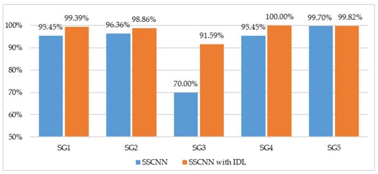 Testing accuracies for SG1-5 of SSCNN without and with IDL. The IDL improves accuracies for SG1-5. Specifically, there is a significant increase in accuracy for SG3 (CCB), which exhibited the lowest accuracy among all models. The accuracy significantly improved from 70.00% to 91.59%.