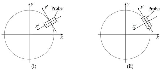 wherein denotes an opportune phase function to be calculated and the voltage V is equal to or depending on whether the probe is in the nominal orientation or rotated by π/2 (see Figure 2). According to [1], V is a function spatially quasi bandlimited to . It can be very well approximated by a function bandlimited to , by properly setting the excess bandwidth factor , which makes it possible to control the aliasing error. It should be noted that a -value slightly greater than one can be suitably used when dealing with the characterization of electrically large AUTs [1].