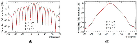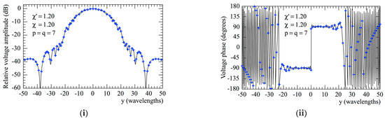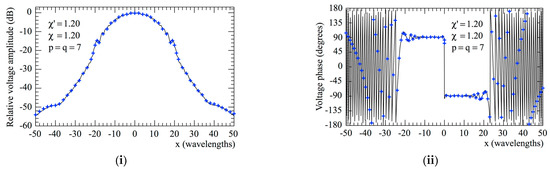 The accuracy of the 2D OSI scheme, obtained by combining Formulas (10) and (15), can be qualitatively and quantitatively assessed. From the qualitative point of view, Figure 6 and Figure 7 show the comparisons of the reconstructed amplitudes and phases with the exact ones relevant to and along the radial lines at φ = 0 and , respectively. It is evident as the reconstructions, both for the amplitudes and phases, match the references very well. It must be underlined that these successful recoveries were achieved by using an excess bandwidth factor , which ensures a negligible band-limitation error [12], and p = q = 7, together with an oversampling factor χ = 1.20 to control the truncation one. Moreover, to prevent an increase in the band-limitation error in close proximity to the pole, the value employed in the interpolation on the spiral was locally increased in such a way that in the zone of the spiral specified by the 32 samples near the pole, the sample spacing was reduced by a factor of 11. Thus, the total number of NF samples on the spiral was 11,959, inclusive of the 320 “extra samples” at a reduced spacing around the pole. The discontinuity jump of 180° in the phase of the voltages and in correspondence with the polar singularity, due to the change in the sign of and at the pole (see Figure 2), is noteworthy. It is also interesting to provide quantitative proofs of the precision of the 2D OSI formula. To this end, the values of , calculated through the 2D OSI formula at the points of a close lattice in the central zone of the scan plane (to ensure the availability of the guard samples), were compared with the exact values. This comparison was carried out by choosing and different values of χ, p, and q. The resulting mean-square and maximum reconstruction errors, normalized to the maximum value of the voltage on the plane, are shown in Figure 8. It is evident that, by increasing the values of χ, p, and q, the reconstruction errors decrease. This provides a criterion to select the appropriate values of the OSI parameters, once the tolerable level of reconstruction error has been fixed.