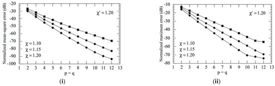 Errors in the evaluation of . (i) Mean-square error; (ii) maximum error. Squares refer to χ = 1.10, circles to χ = 1.15 and rhombus to χ = 1.20.