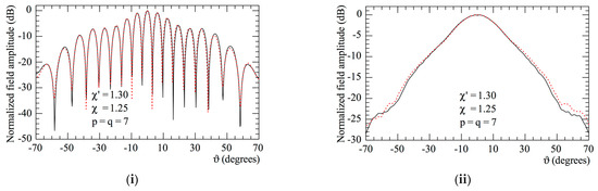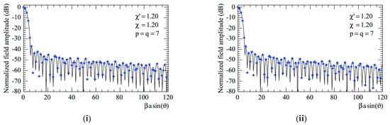 Finally, to evaluate the total efficacy of the proposed NF–FF T technique, the 2D OSI formula was used to precisely evaluate the voltages and at the points of the Cartesian grid required to execute the standard Leach and Paris NF–FF T technique [14]. Then, it is possible to exploit (17) to determine the corresponding needed values of and , since, as previously stressed, the utilized probe radiates, with a very good approximation [24], a far field with a first-order azimuthal dependence. The E-plane and H-plane radiation patterns obtained from the 40,401 NF data reconstructed on the 0.5 λ-spaced square grid with a side length of 100 λ, inscribed in the scanning circle, are compared to the exact patterns in Figure 9. As can be noted, the agreement of the thus obtained FF patterns with the exact ones is very good also in the far out sidelobes region.