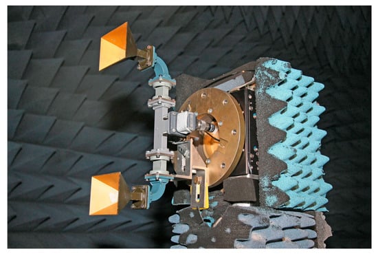 The AUT, a monopulse antenna in the E-plane working at 10 GHz in the sum mode, is realized by assembling two pyramid-shaped horns, fed by a hybrid Tee. The aperture of each horn, placed on the plane xy, has dimensions of 8.9 cm × 6.8 cm, and the aperture centers are 26.5 cm away (see Figure 11). Moreover, the AUT is oriented in such a way that the larger sides of the horn apertures are parallel to the x axis when .