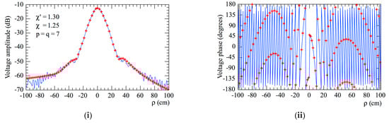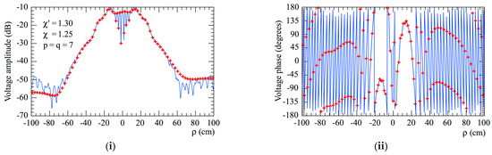 To assess the accuracy of the 2D OSI formula, the magnitudes and phases of the reconstructed voltages and , along the radial lines at and , respectively, are compared in Figure 12 and Figure 13 to those directly measured (references) along these radial lines. To provide a comprehensive analysis, Figure 14 presents the reconstructions of the amplitudes of and on the radial line at . It can be clearly observed that there is very good matching of the measured voltages (solid line) with the interpolated ones (crosses). Some discrepancies are observed, but only for the more peripheral zones of the scanning plane, characterized by very low voltages (lower than −50 dB). Furthermore, the interpolated voltages show a behavior which is smoother than that of the directly acquired voltages, which, on the other hand, appears rippled. This phenomenon occurs because the Dirichlet and Tschebyscheff sampling functions, and the kernel of the OSI expansions, allow one to reject the noise spatial harmonics greater than the antenna’s spatial bandwidth, thus acting as a low-pass filter. The presented reconstructions were performed by choosing p = q = 7.
