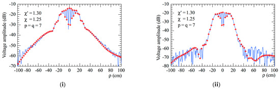 Voltage amplitudes on the radial line at . –––––, reference; , obtained from the planar spiral NF samples. (i) Voltage ; (ii) voltage .