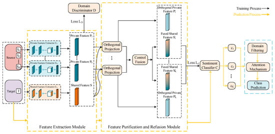 We propose a method for cross-domain sentiment analysis based on feature projection and multi-source attention. The overall structure is shown in Figure 1. In the training phase, we employ two types of feature extractors and a domain discriminator to extract shared features across all the domains and private features in each source domain. Next, we purify the private features via orthogonal projection and process the shared features via controlled fusion, training the sentiment classifier for the source domains. During the prediction phase, we use the trained feature extractors to extract features for the target domain text, and directly obtain the classification labels of the target instances through the source domain classifier. The attention weights assigned to the source domain classifiers are based on feature similarity. Moreover, in the case of too many source domains, we implement domain filtering, based on a multi-source selection strategy to alleviate the negative transfer problem. In the subsequent sections, we detail feature processing, multi-source classification training, multi-source selection strategy, and attention-weighted prediction.