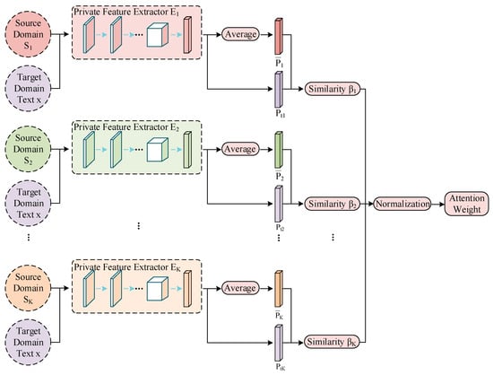 The key to weighted prediction is to find the correlation between the source domains and each text in the target domain. First, all the texts in each source domain are assigned private features through the corresponding domain private feature extractor. Averaging these private features (i.e., the average private feature) captures a large amount of feature information from the domain. Thus, the average private feature can be regarded as a typical feature of each domain. Second, when a text from the target domain passes through the trained private feature extractors, different private features can also be obtained. The similarity between these two types of private features can be calculated separately to measure the correlation between the text and different source domains, obtaining the corresponding attention weight coefficients for different source domains. The specific process is shown in Figure 6.