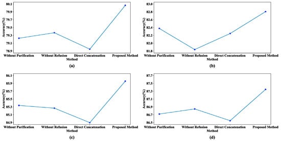 To further validate the effectiveness of FPMA, we conducted ablation experiments on two datasets. Figure 7 shows the results of four different experiments on the Amazon review dataset, verifying the effectiveness of feature optimization processing. In the figure, “Without Purification” indicates that no purification of private features was performed, “Without Refusion” indicates that the shared features were not fused, and “Direct Concatenation” indicates that the private and shared features were simply concatenated together without processing. Figure 7 illustrates that the accuracies for all four domains experienced varying degrees of decline after one or more of the feature processing mechanisms was removed. Moreover, these models consistently failed to reach the performance exhibited by FPMA in all the domains. This observation strongly suggests that the purification of private features and the refusion of shared features can filter out the negative effects of inefficient features, improving the classification accuracy of the model.