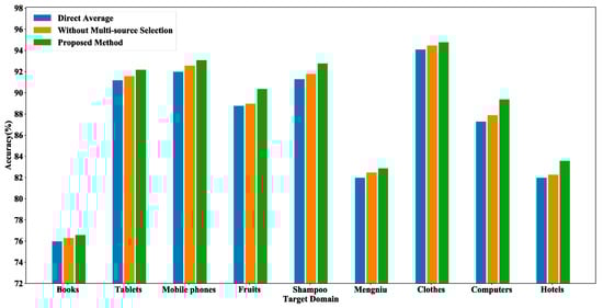 Figure 8 shows the results of three different experiments on the online_shopping_10_cats dataset, aiming to validate the effectiveness of the multi-source selection strategy. In the figure, “Direct Average” represents the direct averaging of the prediction results obtained from all the source domains, and “Without Multi-source Selection” indicates that the experiment used the classification results of all the source domains to make predictions on the target domain text. Figure 8 demonstrates that the accuracy of using all the source domains weighted was slightly higher than the prediction result of direct averaging. After utilizing the multi-source selection strategy, we only implemented the attention mechanism for the filtered source domains, and the accuracy of the prediction results reached the highest out of all nine domains. It is obvious that the multi-source selection strategy can find the source domains that are more favorable to the target domain text classification. It effectively alleviates the effect of negative transfer caused by less relevant source domains, and each text in the target domain selects different source domains based on similarity, which can be more targeted in the prediction process.