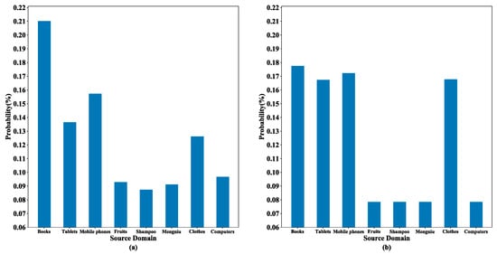 Figure 9 shows the probability distribution for an experiment in which the computer domain is used as the target domain and the other eight domains as the source domains. The left panel shows the probability estimates of the domain discriminator for a text in the computer domain, and the right panel shows the source domain weight distribution obtained according to the multi-source selection strategy and private feature similarity. In the left panel, it can be observed that four of the eight source domains had significantly higher probability estimates, suggesting that these four domains had a strong match with this text in the target domain. Thus, these four domains were reserved using the multi-source selection strategy. In the right panel, the four source domains that had been reserved received greater weights after combining the private feature similarity, while the other domains obtained very small weights through the normalization process. Importantly, this process did not over-strengthen the source domains with previously higher probability estimates (i.e., the corresponding book category in the figure). It effectively addressed the challenge of balancing domain adaptation and private features, enabling the consideration of both aspects in determining the optimal weight allocation method for the target domain text.