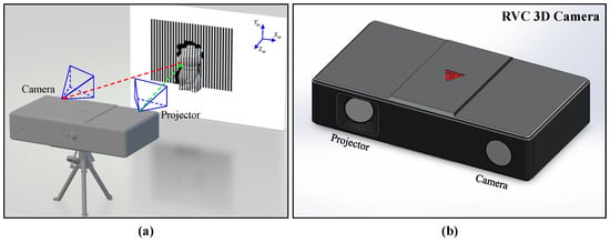 (a) Illustration of a 3D reconstruction system and process; (b) an RVBUST RVC 3D Camera employed in this work.