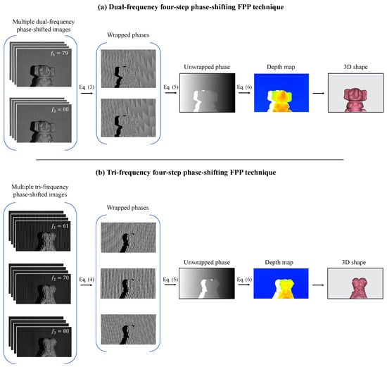 where N and D denote the numerator and denominator of the arctangent function, respectively. Hereinafter, the pixel coordinate will be omitted to streamline the subsequent equations. The result obtained from Equation (3) lies within the range of , and to obtain the true phase, it is necessary to unwrap . In the context of FPP 3D imaging, the multi-frequency phase-shifting algorithm is widely recognized for its ability to handle geometric discontinuities and situations involving overlapping objects with varying height or depth information.