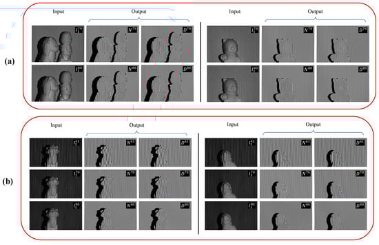 Likewise, the TFFS datasets consisted of 1500 data samples with the resolution of [71,72], with each scene capturing a total of 12 images. These four-step phase-shifted images employed three frequencies: , , and . Figure 3b shows two examples of input–output pairs generated for the TFFS datasets.