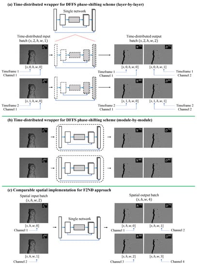 Figure 4a and Figure 5a present the workflow of the proposed TD framework, which is specifically designed for converting sequential fringe-to-phase data. The goal of this framework is to train the model to convert the given fringe patterns into their corresponding phase-shifted information, namely the numerators and denominators. However, unlike the conventional approach that combines all spatial and temporal information in the spatial domain, as depicted in Figure 4c and Figure 5b, the TD framework differentiates and distributes the spatial and temporal information into two distinct learning concepts. The first concept involves extracting features, such as performing the fringe-to-ND (F2ND) conversion, for each individual frame within the time steps. This is illustrated by each row or the horizontal direction in the figures. The second concept focuses on applying the same feature extraction process to consecutive temporal frequencies represented in the vertical direction. By segregating and distributing the spatial and temporal information in this manner, the TD framework enables effective and efficient learning of the desired features.