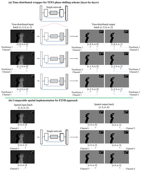 To compare the performance of the framework with previous methods using the spatial domain, a popular spatial F2ND approach is employed, where all the input and output data are organized in the spatial slices, as shown in Figure 4c and Figure 5b. The input–output pair selected for this framework is a commonly used combination in the field. The input consists of consecutive fringe patterns captured at different time steps, each with a distinct frequency. The corresponding output comprises the numerators and denominators associated with these fringe patterns.