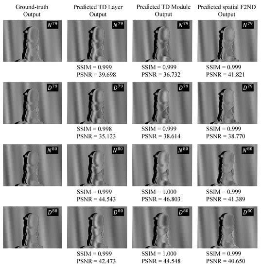 Figure 6 showcases the predicted output of an unseen test object utilizing the DFFS datasets, accompanied by the corresponding evaluation metrics. Upon careful examination, it may initially appear challenging to visually discern any noticeable disparities between the predicted numerators/denominators and the ground truth counterparts. However, an in-depth analysis of the structural similarity index (SSIM), ranging from 0.998 to 1.000, and the peak signal-to-noise ratio (PSNR), which consistently hovers around 40, provides valuable insights. These metrics collectively suggest that the reconstructed images resemble the reference ground-truth images, affirming their high degree of fidelity and accuracy. The TD framework demonstrates comparable performance to the spatial F2ND approach, confirming its effectiveness in capturing spatial information for accurate predictions.