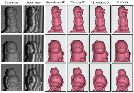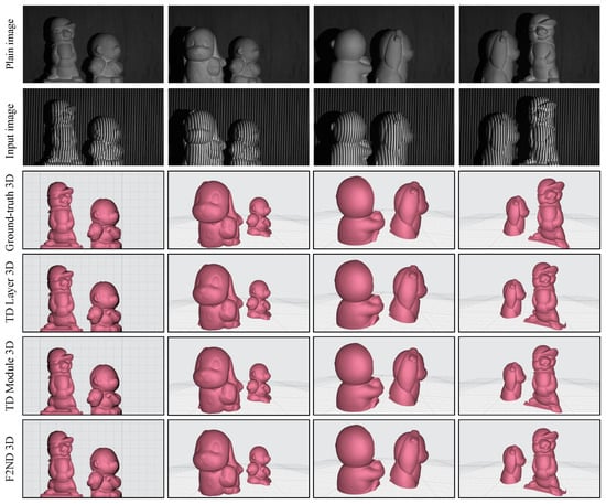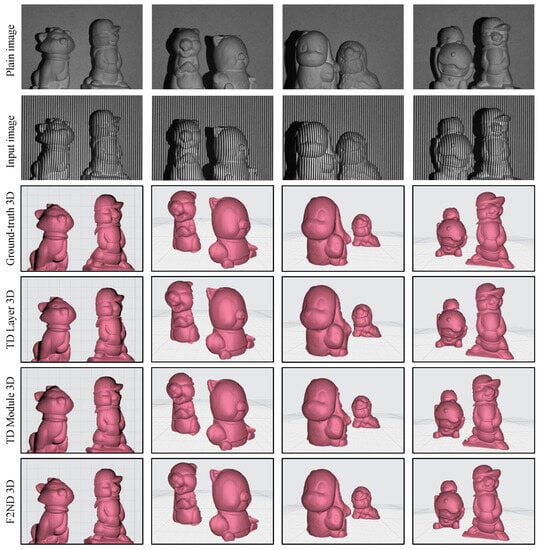 Furthermore, the visual evaluation involves the reconstruction of scenes with multiple objects. The first two rows of Figure 8 showcase four scenes, each featuring distinct objects with varying heights and depths. It is worth mentioning that in the traditional FPP technique, obtaining continuous phase map distributions for separated objects poses a challenge due to the presence of discontinuous fringe order. The shadows in the background of the scenes provide valuable visual cues for observing the differences in depth between the objects, which contribute to the challenges associated with determining phase distributions and fringe order ambiguity. The reconstruction of the scenes reaffirms that both the TD Module and spatial F2ND approaches offer more detailed results than the TD Layer approach while maintaining overall similarity in terms of the shapes. To enhance the visibility of depth differences among the subjects, the grid pattern and view angle were adjusted during the scene reconstruction process.