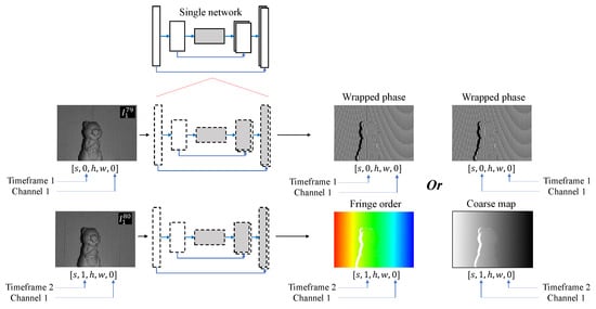 The previously mentioned limitation raises a question regarding the possibility of utilizing different output formats in the proposed approach of the TD framework. The answer is affirmative, provided that the depth channels in both the input and output vectors are consistent. Figure 11 showcases a potential application of the TD framework, where different output formats in the FPP technique are employed. The figure illustrates that the channel depth balance in the temporal slice remains at 1, utilizing either the pair of wrapped phase and fringe order or the pair of wrapped phase and coarse map. However, as stated earlier, using the wrapped phase typically leads to poor 3D reconstruction outcomes. Hence, it has been excluded from this investigation.