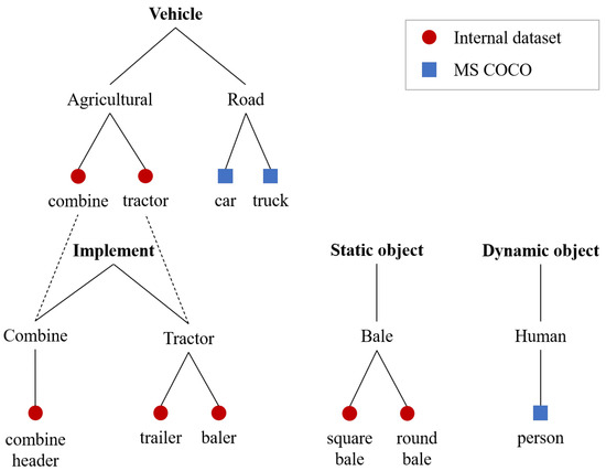 This paper focuses on the detection of objects in the agricultural vehicle’s environment during summer harvest operations. To address the challenge of limited dataset availability for the agricultural domain and leverage the benefits of already available models pre-trained on large-scale datasets able to detect classes from the general domain, we employed two detection models. The first model is a pre-trained model on MS COCO datasets with enabled detection of three classes—‘person’, ‘car’ and ‘truck’—selected as relevant for this scenario. The second model is trained on a smaller agriculture-specific dataset and is trained to detect seven classes: ‘tractor’, ‘combine’, ‘trailer’, ‘combine header’, ‘baler’, ‘square bale’ and ‘round bale’. Both models are based on the YOLOv5 [21] architecture. We observed that combining the detection results from both models by simple concatenation leads to redundant detection of agricultural vehicles as road vehicle classes. These two groups of classes share similar visual appearances and belong to the same higher-level category, ‘Vehicle’, as illustrated in the class hierarchy shown in Figure 1.