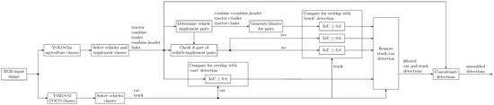 The diagram of the ensemble module is provided in Figure 2. First, the image is passed through both detection models and detection results are obtained. The detections for classes belonging to agricultural vehicles and implements are processed to determine which detections form vehicle–implement pairs. Then, for every vehicle–implement pair, a bounding box for the vehicle object and a bounding box for the implement object are merged to form a new bounding box around the vehicle–implement pair. Additionally, all vehicle and implement detections that are a part of the vehicle–implement pair are flagged. The bounding boxes corresponding to vehicle–implement pairs are compared for overlap with detections of class ‘truck’ coming from the pre-trained model. If the overlap exceeds a certain threshold, the ‘truck’ detection is removed. The individual vehicle and implement detections that have been determined as part of the vehicle–implement pair are also compared with ‘truck’ detections in the same way, and ‘truck’ detections are removed based on the overlap threshold. Individual vehicle and implement detections that are not part of vehicle–implement pairs are also compared to ‘truck’ detection, but in this case, the overlap threshold for removal of ‘truck’ is higher. When it comes to the class ‘car’, the detections are compared with all detections belonging to agricultural vehicles or implements and removed if the overlap exceeds the thresholds. Finally, the remaining ‘truck’ and ‘car’ detections are concatenated with detections of agricultural classes.